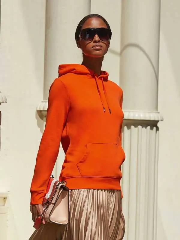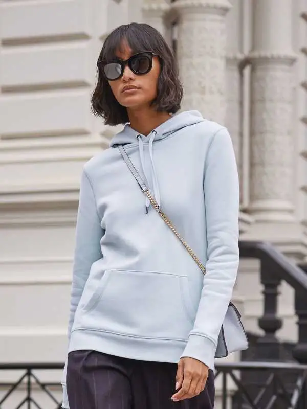 Felpa di alta qualità con cappuccio foderato in jersey, cordoncini piatti con eleganti punte di metallo, struttura con cuciture laterali, nastro parasudore resistente, mezzaluna in single Jersey sulla schiena per un look premium e una maggiore durata nel tempo. Tessuto PST, felpata internamente, esterno 100% cotone pettinato.