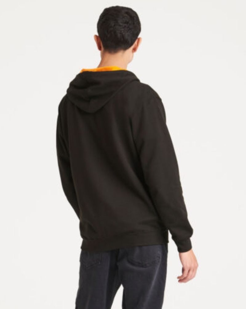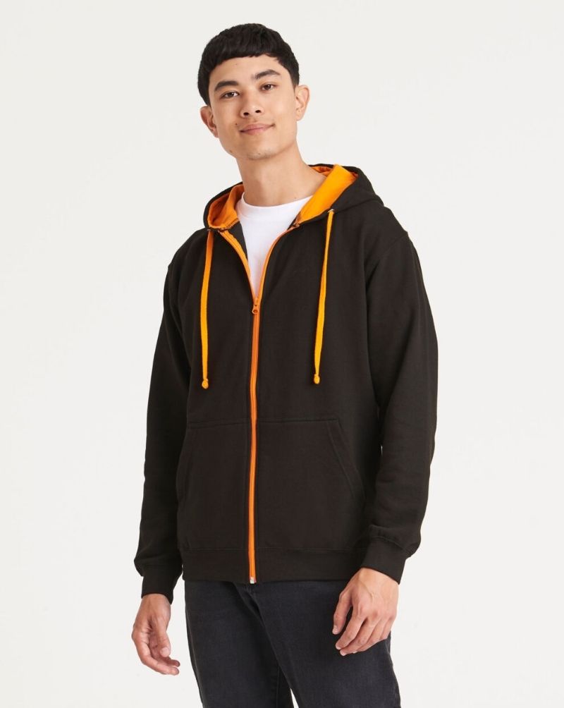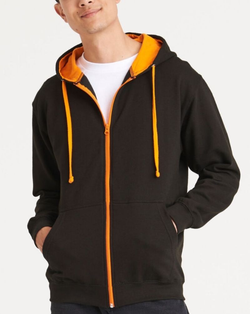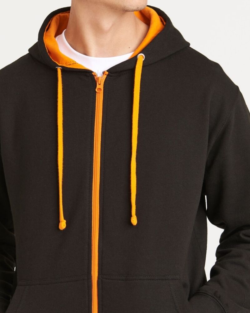 Felpa con cappuccio doppio strato e chiusura con zip in plastica. Cuciture doppie a dettaglio, interno del cappuccio e cordoncini piatti a contrasto, tasca a marsupio (non è possibile stampare in quest’area), felpata internamente, polsini e orlo a costine.