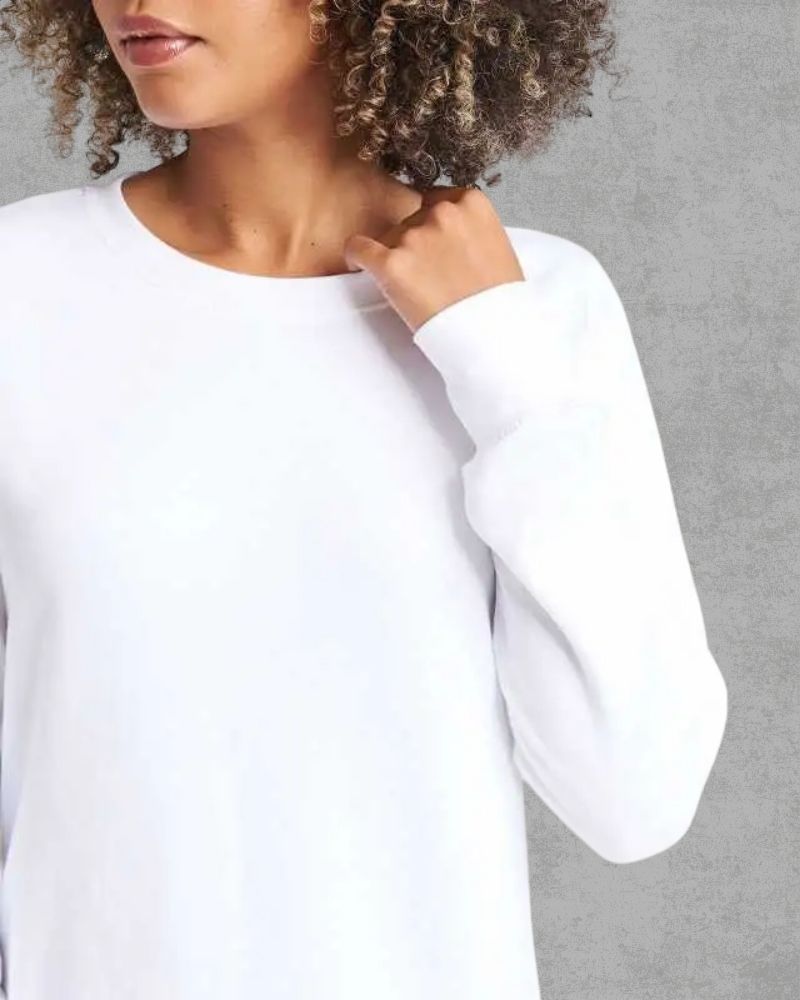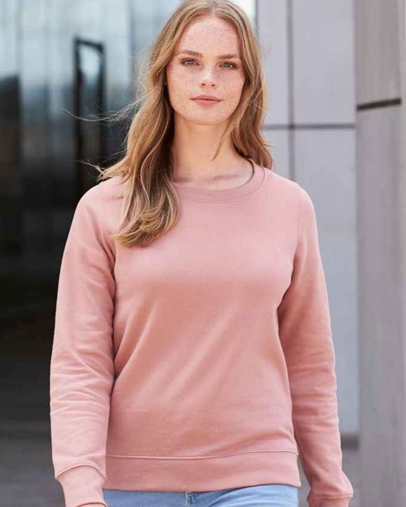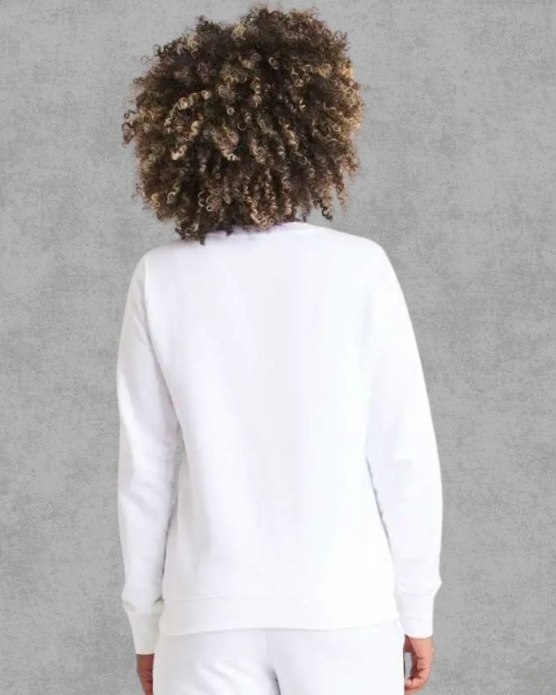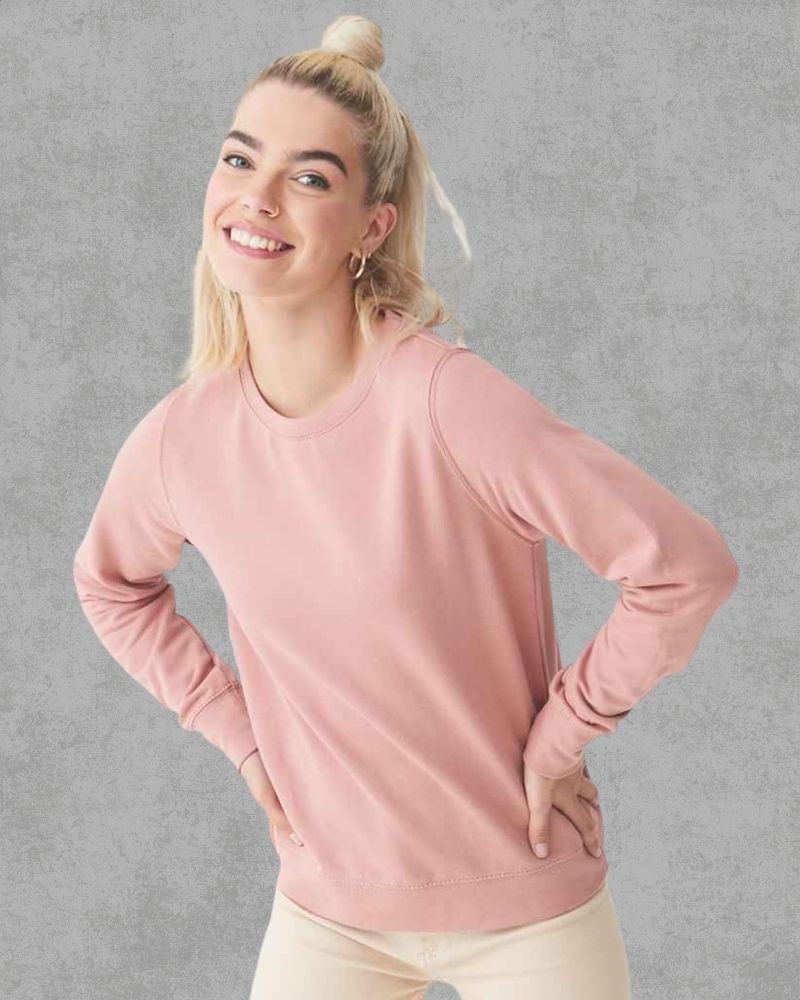 Felpa girocollo, felpata internamente, taglio femminile classico. Cuciture doppie, polsini e orlo a costine. Tessuto morbido sul davanti per una superficie di stampa ideale.