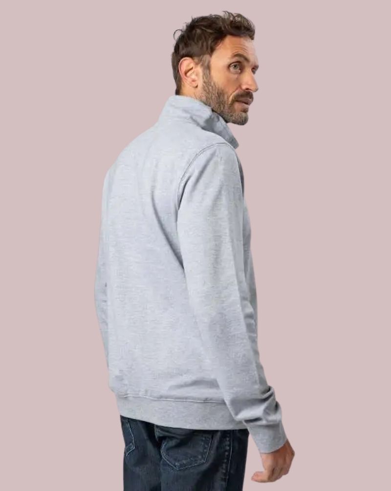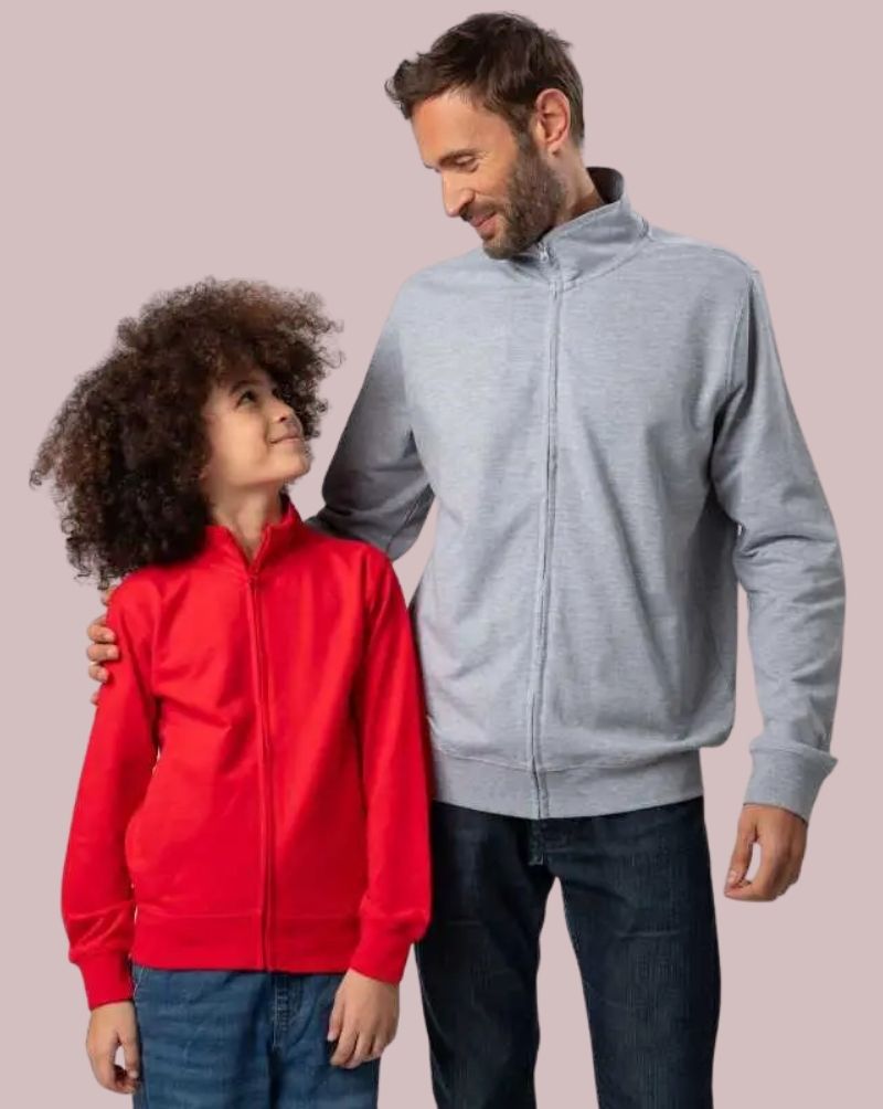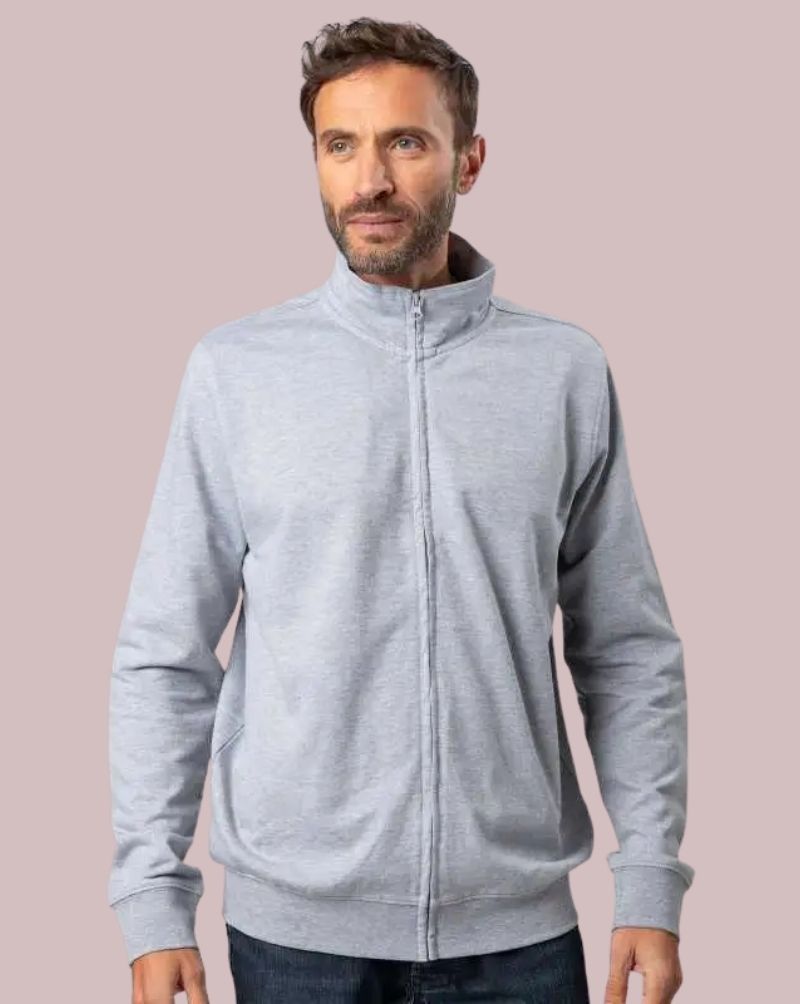 Felpa french terry con zip intera, maniche set-in, collo alto, tasche a filetto. Orlo inferiore e polsini in costina, struttura con cuciture laterali. Parte esterna: 100% cotone, parte interna: 50% cotone, 50% poliestere.