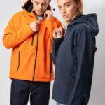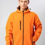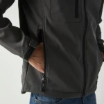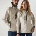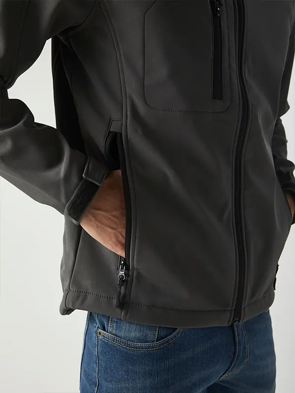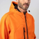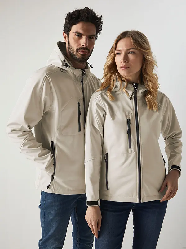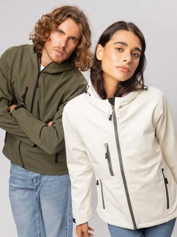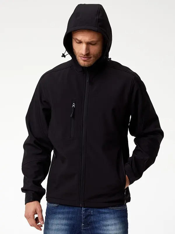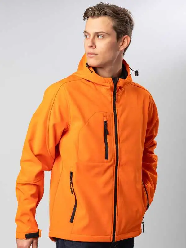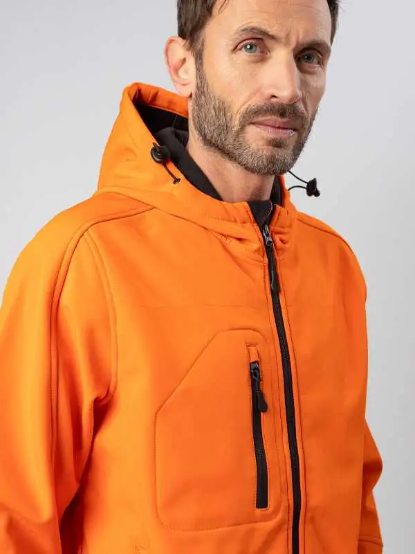 Giacca in softshell a 3 strati, cappuccio con fermi in plastica, occhielli e cordino neri. Due tasche laterali con zip, una taschino sul petto con zip, tirazip in plastica, zip interna lato cuore per la personalizzazione, polsini regolabili con velcro, interno in micropile. Bordo inferiore con cordino regolabile