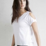 T-shirt manica corta con foro sulla spalla, girocollo, più lunga nella parte posteriore. Struttura con cuciture laterali.