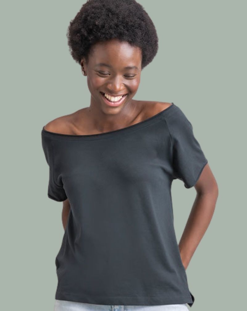 scollatura a taglio vivo, spalla scoperta, spacchetti laterali, etichetta strappabile.