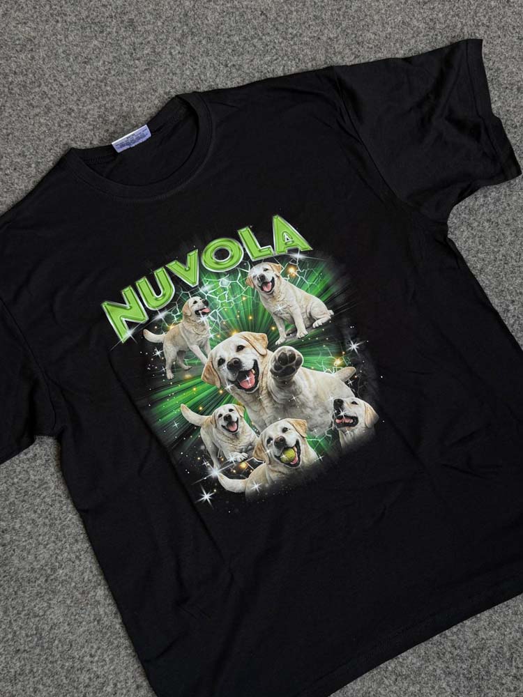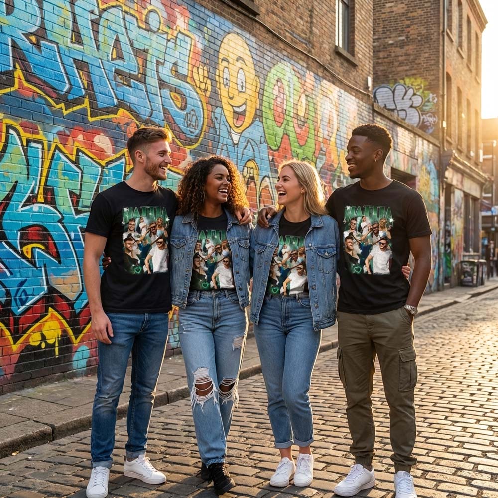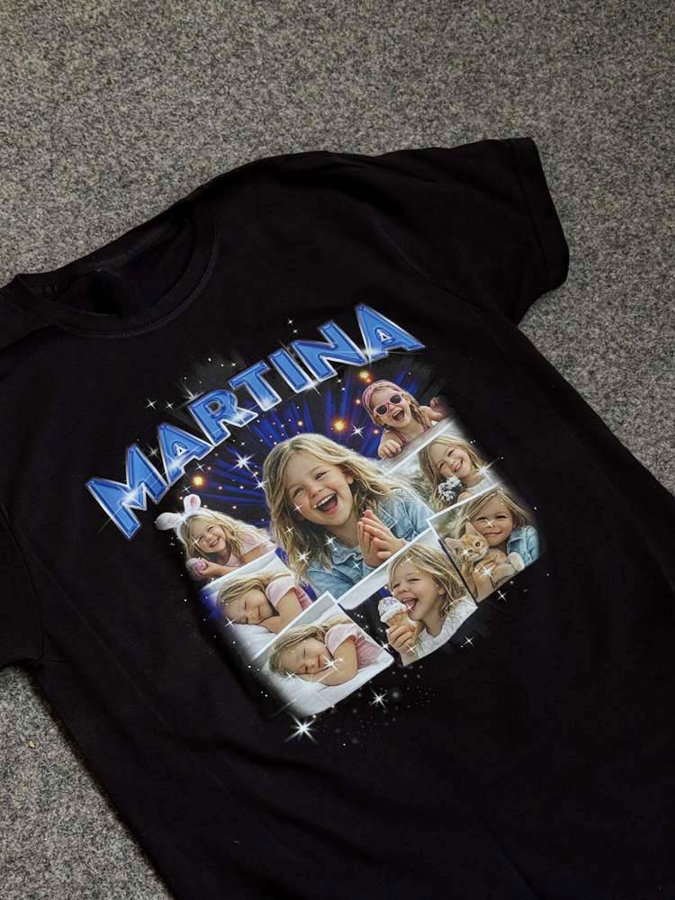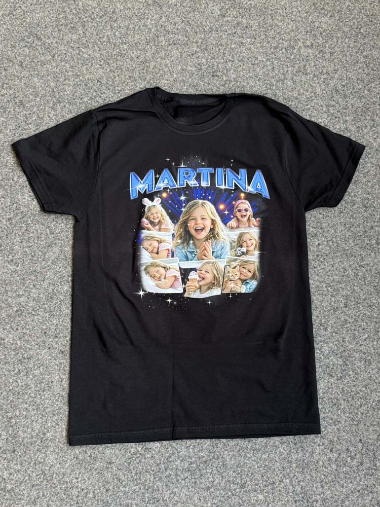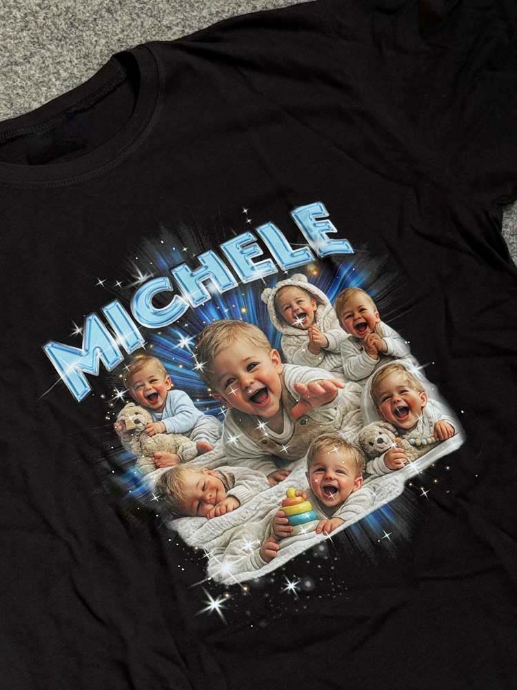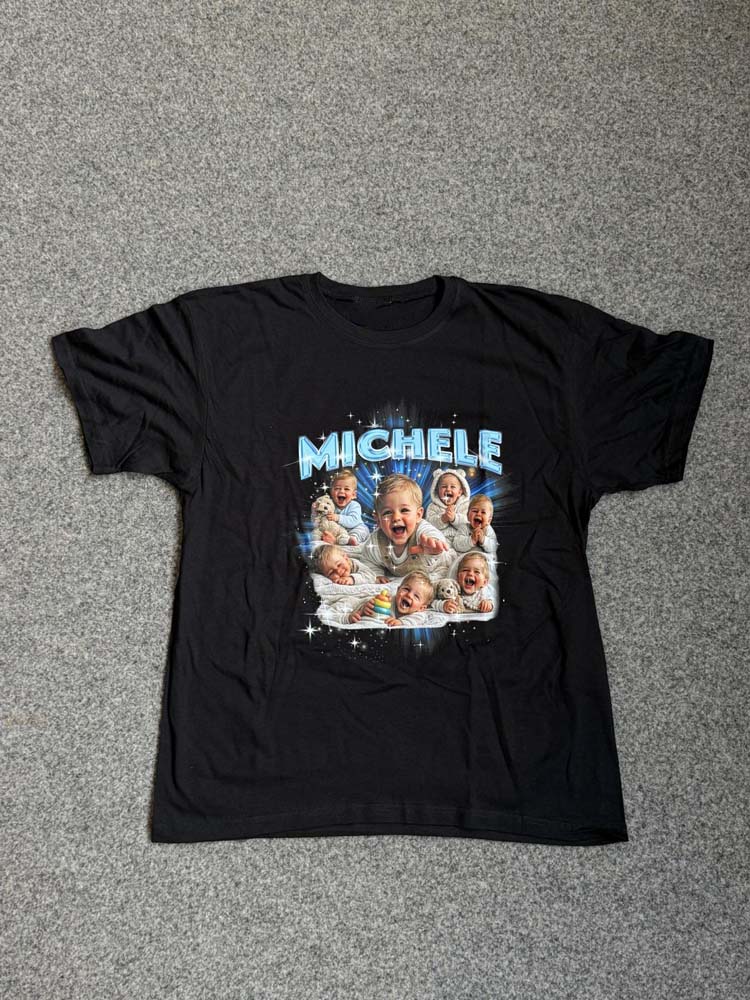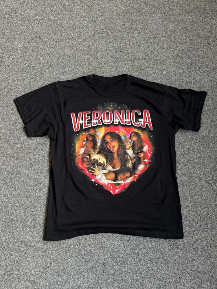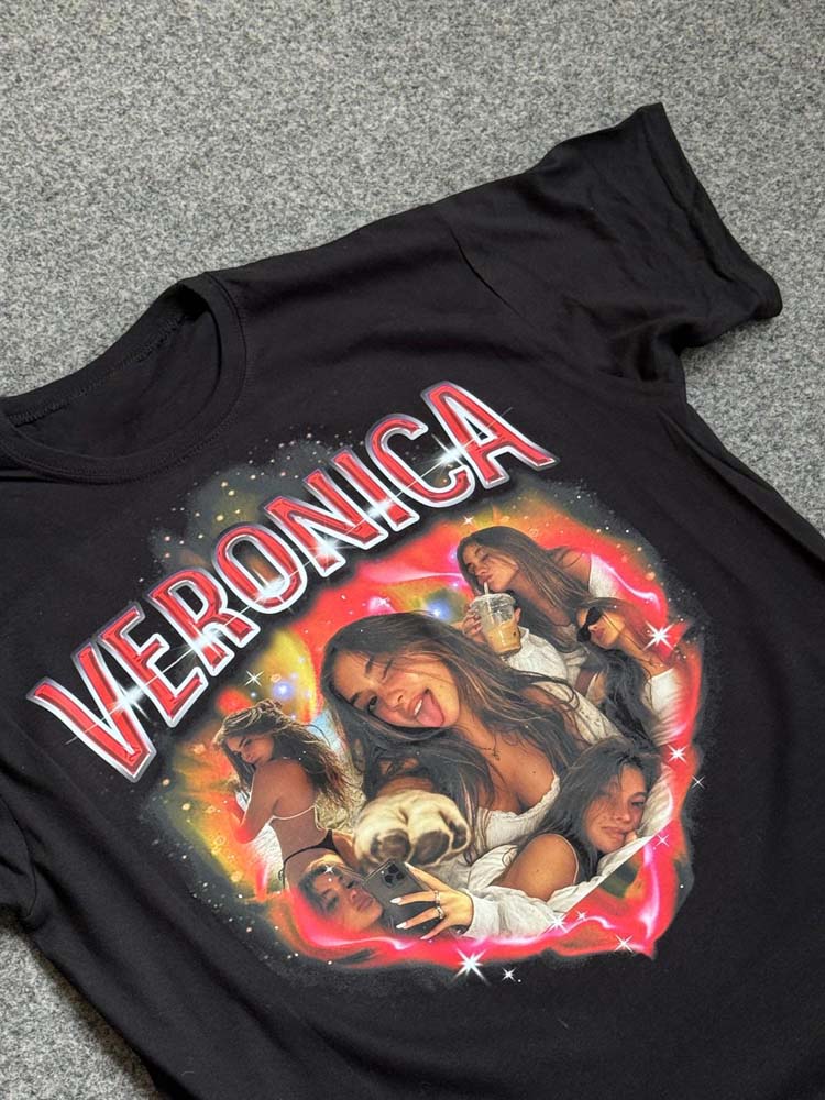 Il risultato è una t-shirt personalizzata in stile Y2K dal forte impatto visivo, perfetta per eventi, compleanni, addio al celibato/nubilato o semplicemente per creare un capo streetwear unico.